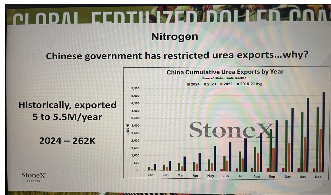 China as an N exporter -> 10% exports compared to historical numbers-> 500,000MT vs over 5,000,000MT to grow more crop at home -> will impact some global supplies: